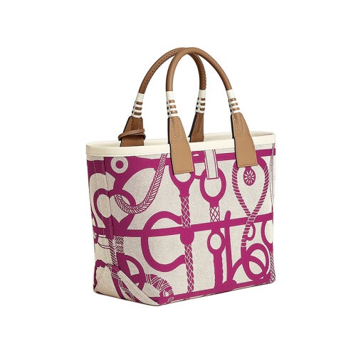 【包税】HERMES/爱马仕24新款 女士米白色帆布粉紫色图案手提包H083621CKAC