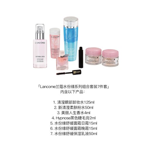 Lancome兰蔻水份缘系列组合套装7件套 乳液50ml+日霜15ml+晚霜15ml+睫毛膏2ml+香水4ml+粉水50ml+眼部卸妆水125ml